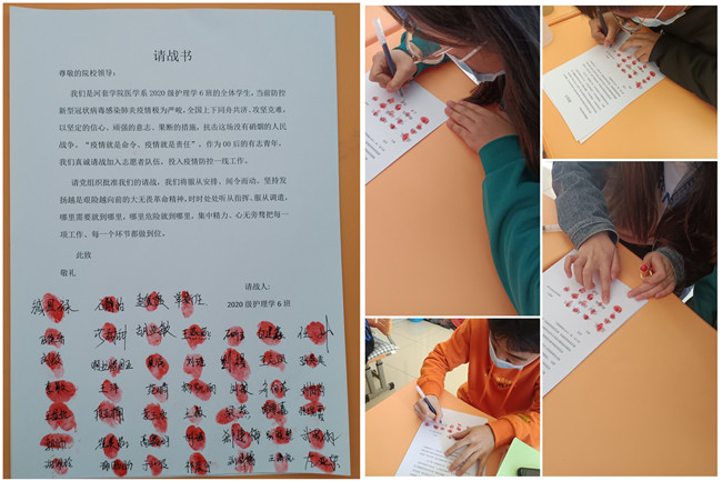 疫情就是命令,防控就是责任,面对突如其来的疫情,医学系2020级护理学6班团支部的同学们积极相应学院号召,纷纷签下请战书,报名参加校园疫情防控志愿服务队,积极投身疫情防控一线,展现了河院学子敢于担当、甘于奉献的精神。