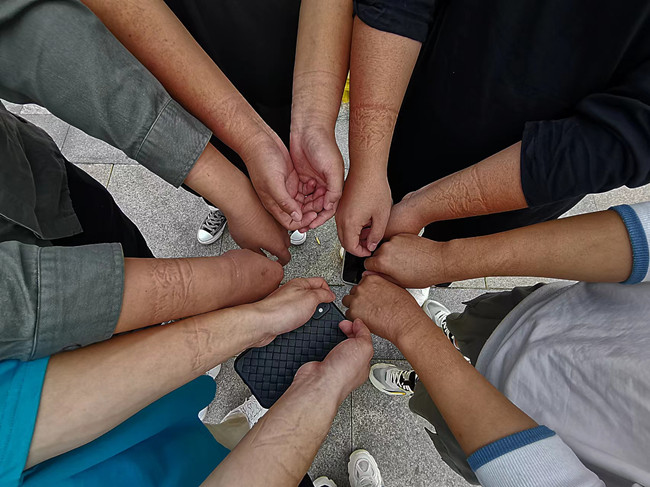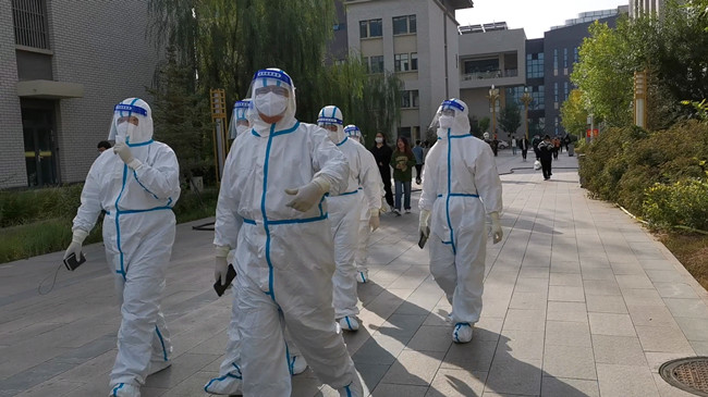 他们穿着一层又一层厚重的防护服,戴着紧紧的防护面屏和口罩。晨曦朝露去,披星戴月归。在长时间的工作后,他们的脸上和胳膊上都会布满崎岖不平的印记。寒风侵肌,面屏上的水雾从未消散,手上单薄的医用手套成了他们防寒的唯一工具。酒精喷洒过的外衣冰冷刺骨,几乎零度的天气,也挡不住他们对工作的热情。他们用实际行动感染着身边的每一个人,让抗“疫”正能量充满了校园的每一个角落。