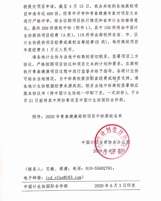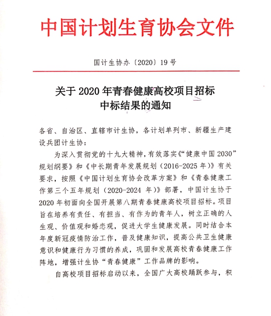 从中国计划生育协会印发的《关于2020年青春健康高校项目招标中标结果的通知》(国计生协办〔2020〕19号)中获悉,由LDSports乐动体育App医学系团总支申报的2020年青春健康高校项目“青春健康,同伴同行”,成功中标中国计生协会2020年面向全国开展的第八期青春健康招标项目。